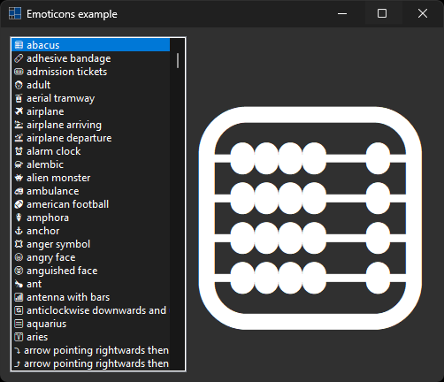 emoticons_list_box.items().add({string::format("{} {}", emoticon, emoticon.name()), emoticon});