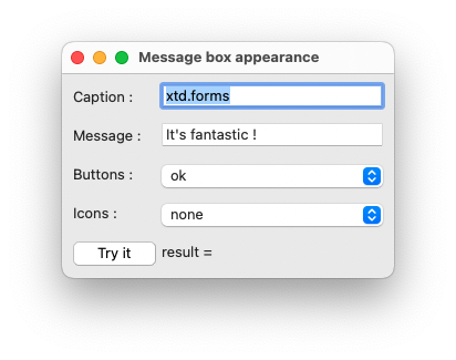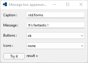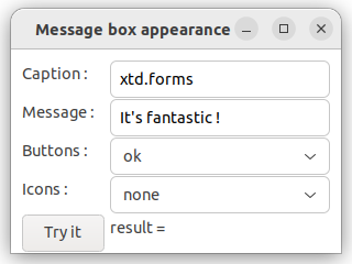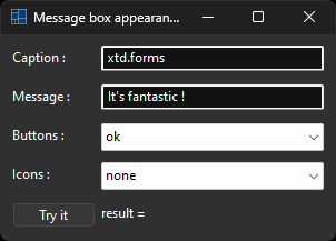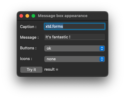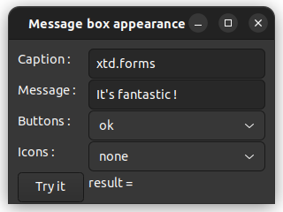 label_dialog_result.text(string::format("result = {}", message_box::show(*this, text_message.text(), text_caption.text(), as<message_box_buttons>(choice_buttons.selected_item().tag()), as<message_box_icon>(choice_icons.selected_item().tag()))));