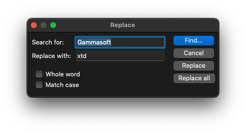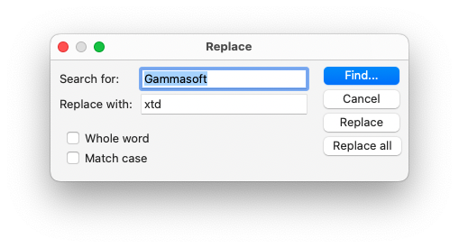 diagnostics::debug::write_line(string::format("Replace : find string [{}], replace string [{}], match case [{}], whole word [{}]", e.find_string(), e.replace_string(), e.match_case(), e.whole_word()));
