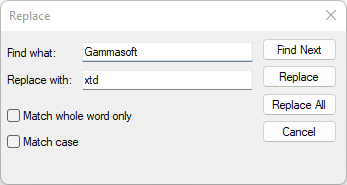 diagnostics::debug::write_line(string::format("Replace all : find string [{}], replace string [{}], match case [{}], whole word [{}]", e.find_string(), e.replace_string(), e.match_case(), e.whole_word()));