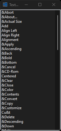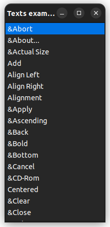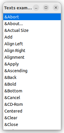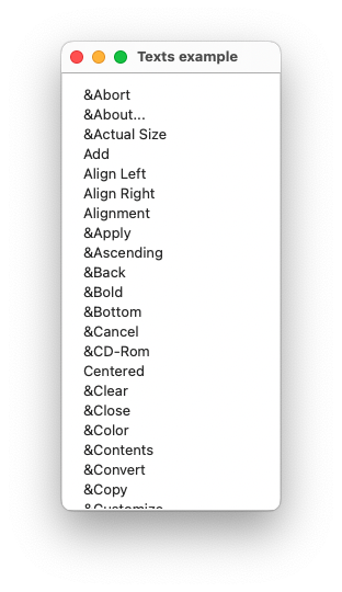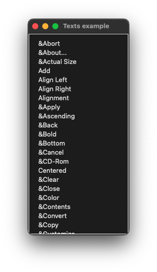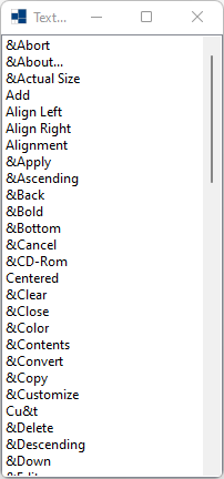 list_box_texts.items().add_range({texts::abort(), texts::about(), texts::actual_size(), texts::add(), texts::align_left(), texts::align_right(), texts::alignment(), texts::apply(), texts::ascending(), texts::back(), texts::bold(), texts::bottom(), texts::cancel(), texts::cdrom(), texts::centered(), texts::clear(), texts::close(), texts::color(), texts::contents(), texts::convert(), texts::copy(), texts::customize(), texts::cut(), texts::del(), texts::descending(), texts::down(), texts::edit(), texts::execute(), texts::file(), texts::find(), texts::first(), texts::floppy(), texts::font(), texts::forward(), texts::harddisk(), texts::help(), texts::home(), texts::ignore(), texts::indent(), texts::index(), texts::info(), texts::italic(), texts::jump_to(), texts::justified(), texts::last(), texts::network(), texts::new_(), texts::no(), texts::ok(), texts::open(), texts::options(), texts::paste(), texts::preferences(), texts::print(), texts::print_preview(), texts::properties(), texts::quit(), texts::redo(), texts::refresh(), texts::remove(), texts::replace(), texts::retry(), texts::revert_to_saved(), texts::save(), texts::save_as(), texts::search(), texts::select_all(), texts::spell_check(), texts::stop(), texts::strikeout(), texts::tools(), texts::top(), texts::undelete(), texts::underline(), texts::undo(), texts::unindent(), texts::up(), texts::view(), texts::yes(), texts::zoom_in(), texts::zoom_out(), texts::zoom_to_fit()});