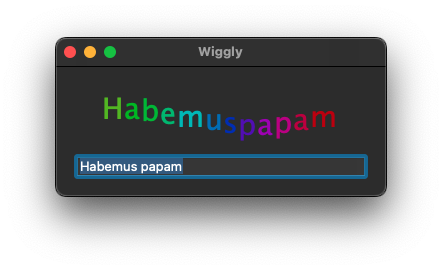 e.graphics().draw_string(string::format("{}", wiggly_text[i]), font(), solid_brush {color::from_hsb(360.0f / sins.length() * index, 1.0f, 0.75f)}, point::subtract(pos, point(0, sins[index] * font().height() / 400)));